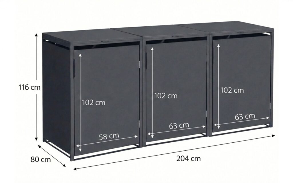 Deze premium kliko-ombouw is geschikt voor containers van 140L, 240L en 360L en is de ideale oplossing voor het stijlvol en veilig opbergen van afvalcontainers. Het eerste vak is geschikt voor containers tot 240L, terwijl de overige vakken ruimte bieden aan containers tot 360L.